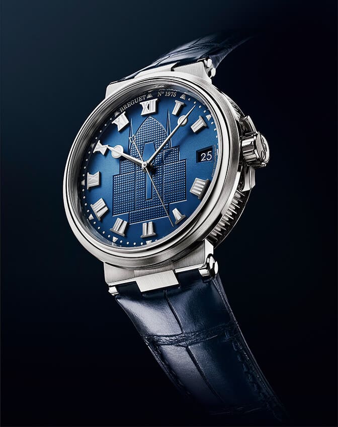 Breguet célèbre son partenariat avec Race for Water en dévoilant une édition spéciale de son modèle Marine 5517 décliné dans un boîtier en titane avec un cadran bleu décoré de la silhouette du bateau guillochée à la main.
