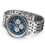 Depuis son lancement 70 ans plus tôt, de nombreux exemplaires de l’icône de Breitling sont apparus, mais cette nouvelle Navitimer reprend ses caractéristiques les plus emblématiques, tout en y apportant quelques retouches modernes. Une règle à calcul aplanie et un verre bombé créent l’illusion d’un profile plus élancé. Alterner des éléments métalliques polis et brossés donne une finition à la fois brillante et sobre. De nouvelles couleurs dans des teintes de bleu, de vert et de cuivre, définissent plus particulièrement les choix de cadrans modernisés. Enfin, s’il y a une nouvelle singularité qui suscite la nostalgie, c’est bien le retour des ailes de l’AOPA sur leur position initiale à 12 heures.
