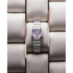 Ce modèle de 28 mm arbore un boîtier et un bracelet en acier inoxydable, ainsi qu’un superbe cadran fleur de patchouli comportant des index et des éléments appliqués en or blanc 18K.