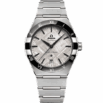 Le sublime cadran est composé d'un véritable fragment de météorite ferreuse qui a reçu un traitement galvanisé gris rhodium. Le motif naturel de la météorite est propre à chaque modèle, il n'y a donc jamais deux cadrans identiques. Un guichet de date à 6 heures ainsi que des aiguilles, des index et une étoile Constellation en PVD noir ornent également le cadran.