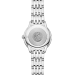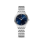 Sur ce modèle de 30 mm en acier inoxydable, le cadran PVD bleu présente une finition soleillée. L’affichage se distingue par des aiguilles rhodiées, ainsi que par l’alternance de chiffres romains et d’index cabochon.