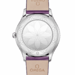 Façonné en acier inoxydable poli, le boîtier de 36 mm est serti de 38 diamants taille pleine (0,49 ct) formant d'élégantes volutes sur chacun de ses flancs. Sous le verre saphir bombé se trouve un cadran en PVD violet sablé, orné d'un motif pivoine obtenu par décoration au laser. La couronne est sertie d'un unique diamant taille pleine, tandis que les aiguilles, les index et le logo OMEGA sont rhodiés.