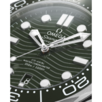 Ce modèle de 42 mm en acier inoxydable est surmonté d’une lunette en céramique verte arborant une échelle de plongée en émail blanc. Le cadran, également en céramique verte polie, est décoré de vagues gravées au laser et comporte un guichet de date à 6 heures.