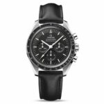 Cette Moonwatch de 42 mm en acier inoxydable est montée sur un bracelet en cuir noir. Elle présente un verre saphir sur l’avant comme sur le fond de boîtier. Inspirée de la Speedmaster 4e génération portée sur la Lune, cette montre au boîtier asymétrique arbore un cadran noir à degrés rehaussé du logo OMEGA appliqué. La lunette en aluminium anodisé est quant à elle frappée du point signature au-dessus du chiffre 90.