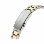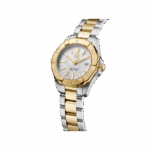 Faites sensation avec cette association étincelante d'or et d'acier. Affichant une taille discrète de 27 mm, la montre est dotée d'une lunette tournante unidirectionnelle plaquée or 18 carats et d'une couronne vissée à 3 heures. Le cadran est en nacre blanche.