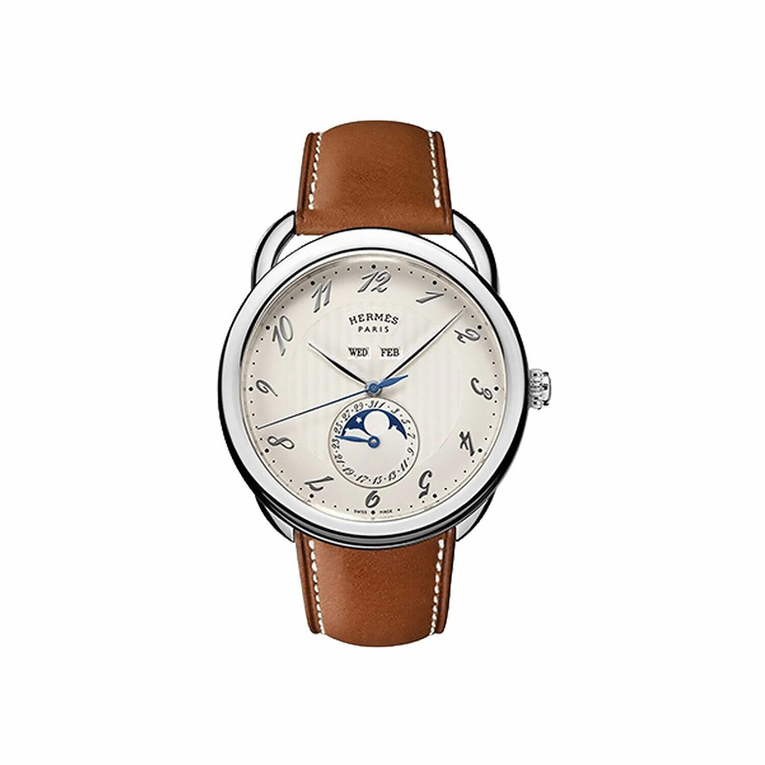 Hermès Arceau, mouvement automatique, boitier acier 43mm, étanche à 30M, verre saphir, cadran argenté chiffres arabes, avec indication de la date, jour, mois, phase de lune, bracelet cuir veau, boucle ardillon acier
