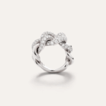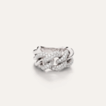 Les bagues déclinent la voluptuosité des célèbres maillons de gourmettes réinterprétés dans de somptueuses bagues lisses et soyeuses. Les maillons articulés sont reliés à une tige solide qui donne naissance à de délicats mouvements autour du doigt.