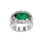 Création Lionel Meylan Bague en or gris 750 sertie de 36 diamants taille brillant au total 0,48ct G-vs et 1 émeraude ovale 2,58ct 10,3x7,7mm. Avec certificat Gübelin (Brésil)