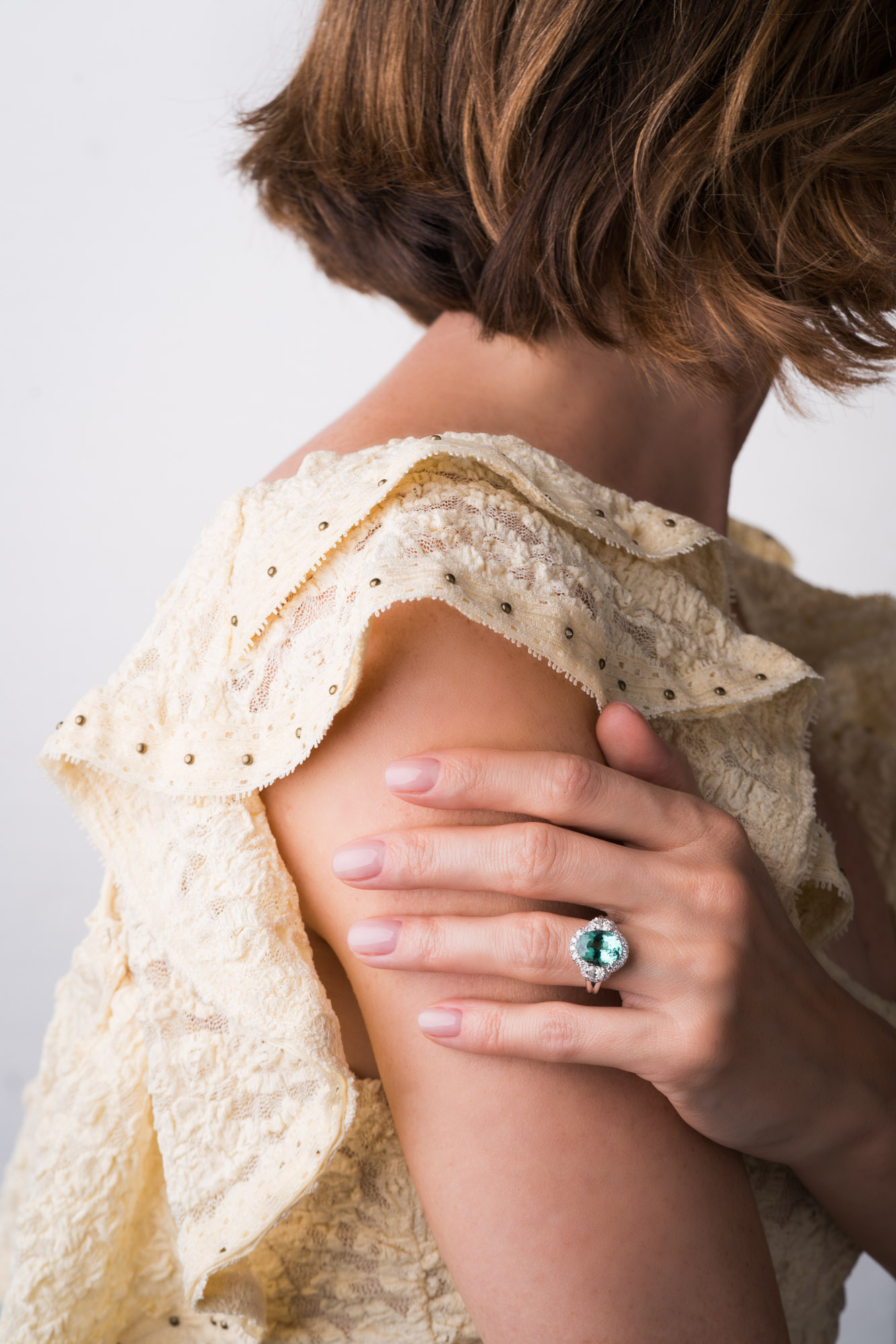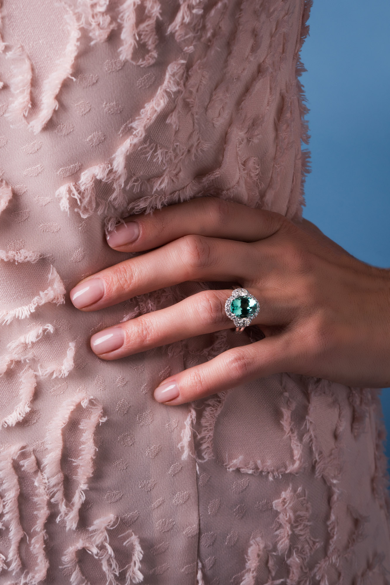 Lionel Meylan Création, "Lagoon" bague or blanc 750, sertie d'une tourmaline bleu-vert, taille coussin ovale de 3.66ct. Provenance: Mozambique, épaulée de deux diamants taille ovale total 0.60ct G-VS, entourés de 36 diamants taille brillant total 0.388ct F-G/VS.