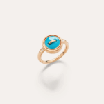 Cette nouvelle bague réversible, véritable œuvre d’artisanat, dévoile d’un côté une surface sophistiquée en or rose soulignée d’un filet de diamants, tandis qu’un simple mouvement révèle un turquoise pur délicatement bordé d’un fil d’or rose. Cette turquoise a été rigoureusement sélectionnée pour son absence d’inclusions — une qualité rare dans la pierre naturelle. L’alliance de la turquoise, de l’or rose et des diamants offre deux styles distincts, témoignant de la polyvalence signature et de l’expertise gemmologique de Pomellato.