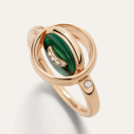 Cette nouvelle bague réversible incarne le savoir-faire d’exception de la Maison, révélant d’un côté l’intensité de la malachite sublimée par un filet serti de diamants, soigneusement sélectionnée pour sa teinte profonde et ses superbes veines naturelles. D’un simple mouvement, elle laisse apparaître la délicate nacre rehaussée d’un fil d’or rose. Le contraste entre les motifs organiques de la pierre et la précision de l’artisanat Pomellato confère à cette création audacieuse une esthétique qui célèbre à la fois la beauté naturelle et l’esprit espiègle de la Maison.