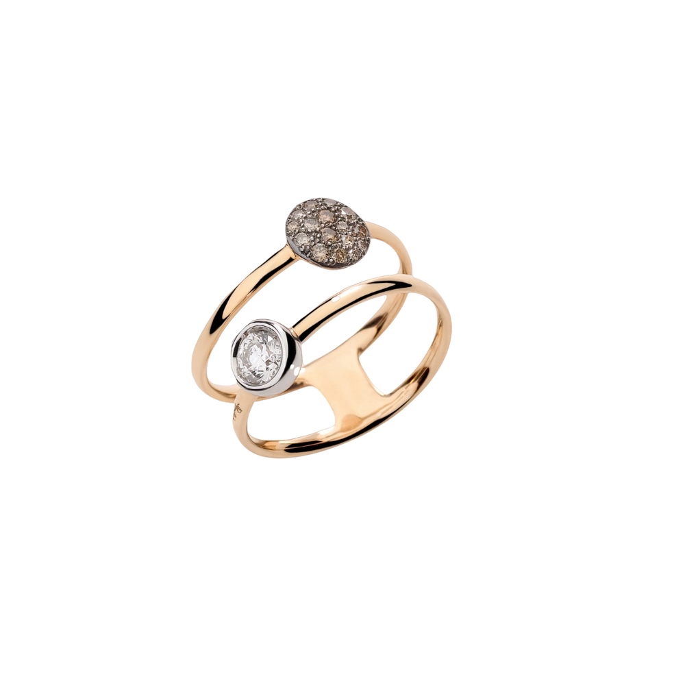 Formée par deux bandes réunies par un pont en or sur le dessous, la bague double est agrémentée d’un pavé de diamants cognac et d’un solitaire en diamant blanc.
