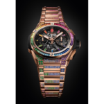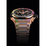 Boîtier : King Gold 18 K satiné et poli serti de 120 pierres colorées : rubis, saphirs roses, améthystes, saphirs bleus, topazes bleues, tsavorites, saphirs jaunes et saphirs orange