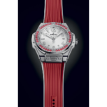 Bracelet : Bracelet en caoutchouc ligné blanc et rouge. Bracelet supplémentaire : entièrement rouge.