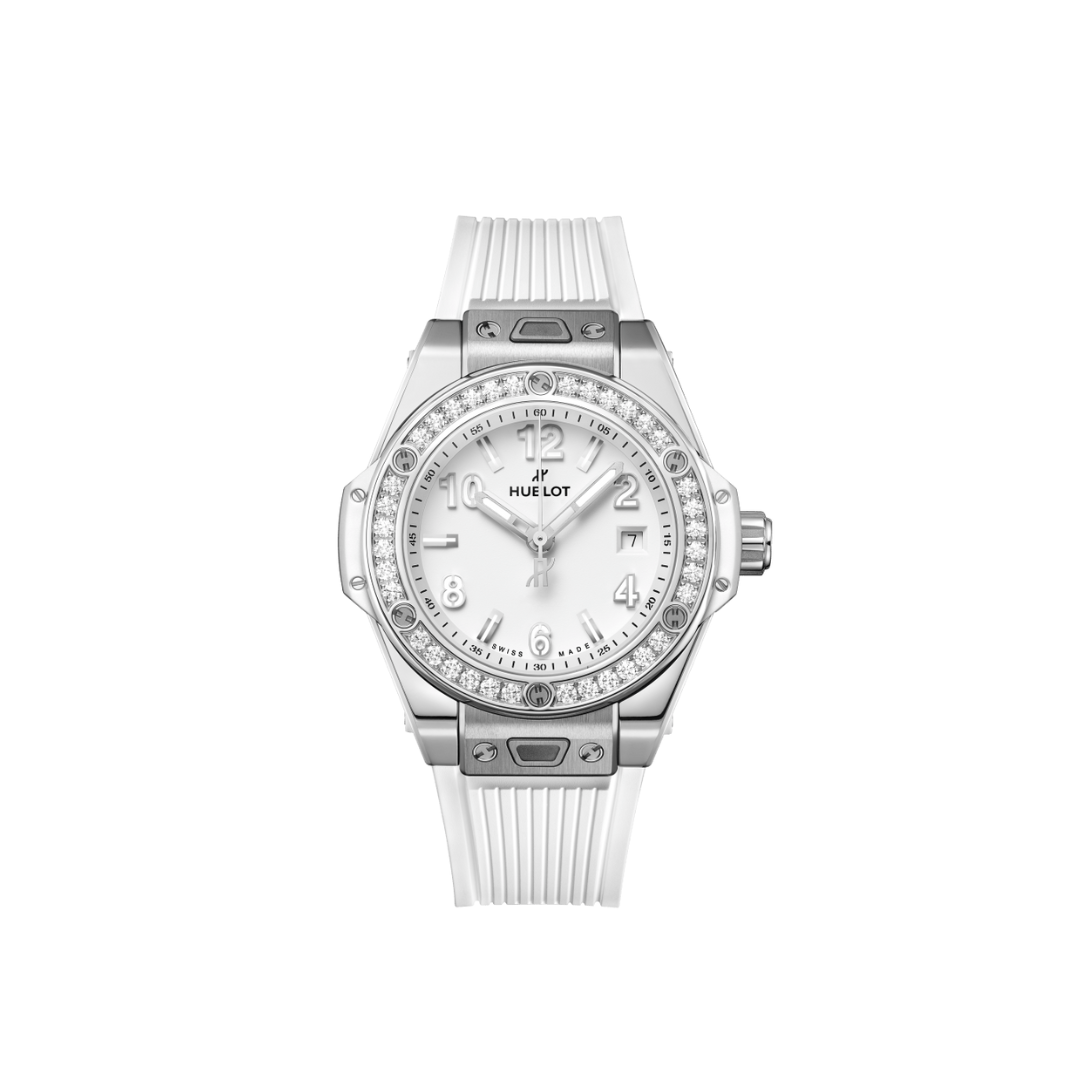 Hublot, Big Bang One Click, mouvement automatique, boîte acier 33mm, lunette sertie de 36 diamants 0.7596cts, cadran blanc, chiffres arabes et index, date à 3h, fond glace saphir, bracelet caoutchouc blanc, boucle déployante acier