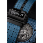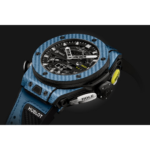 Bracelet : Bracelets en caoutchouc noir avec décor texturé en fibre de carbone et cuir de veau bleu