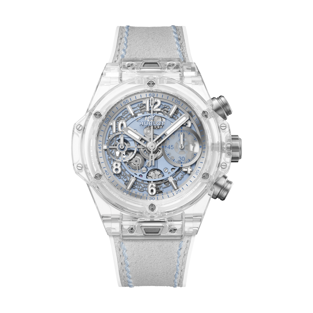 Bracelet : Caoutchouc blanc et cuir de veau bleu. Bracelet supplémentaire : caoutchouc blanc et cuir de veau blanc.