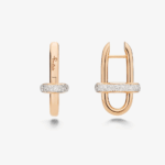 Ces boucles d'oreilles transforment le maillon classique en bijou contemporain, réalisées en or rose avec diamants blancs. Chaque pièce alterne un maillon serti de diamants - dans le pavé irrégulier caractéristique de Pomellato sur or rose rhodié - et un maillon en or rose poli.