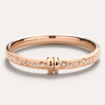 Pomellato a créé la collection de sinueux bijoux en or Iconica en hommage à sa riche tradition d’orfèvrerie. Chaque création artisanale Iconica est un chef-d’œuvre de haute joaillerie pour les passionnés de bijoux. Pour la première parure sertie fantaisie, Pomellato a sculpté un nouveau bracelet jonc Iconica à fermeture facile en or rose et diamants taillés à la main sous forme d’étoiles, de triangles, de gouttelettes, de diamants et de carrés.