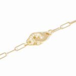 Le bracelet Menottes dinh van R10 s’ajoute à la ligne iconique, symbole d’amour et d’attachement. Décliné dans une version en or jaune et semi-pavée diamants, ce bijou nous séduit par son fermoir qui semble presque impossible à démêler et sa chaîne maillon signature.