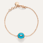 Ce nouveau bracelet réversible révèle une surface sophistiquée en or rose, rehaussée d’un filet de diamants d’un côté, tandis qu’une simple rotation laisse apparaître un éclatant turquoise immaculé délicatement bordé d’or rose. Cette turquoise a été minutieusement sélectionnée pour l’absence d’inclusions, une qualité rare dans la nature. L’association du turquoise, de l’or rose et des diamants offre deux styles complémentaires, illustrant à merveille la polyvalence emblématique de Pomellato et son savoir-faire exceptionnel dans la sélection des gemmes.