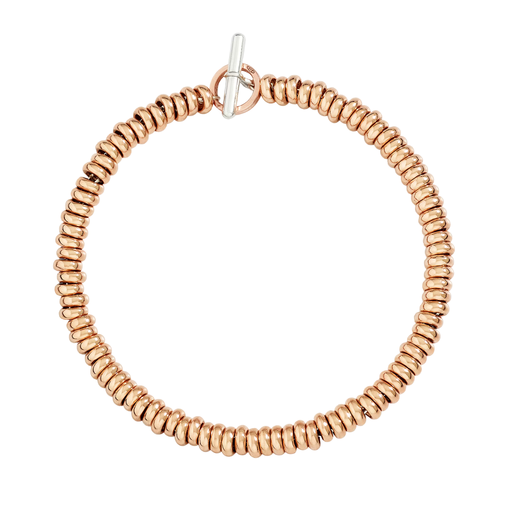 Bracciale Rondelle in oro rosa 9K con catena e t-bar in argento 925 e anello brisè in oro rosa 9K. Ago in argento 925 incluso.