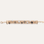 Les bijoux Sabbia de Pomellato mettent en valeur le délicat savoir-faire milanais avec leur monture en diamant originale. Ce bracelet maillé rose et doré élégant, orné de dix disques de différentes tailles parsemés de diamants blancs, bruns ou noirs étincelants, illustre le savoir-faire inégalé de Pomellato pour créer des montures en diamant et des chaînes de qualité.