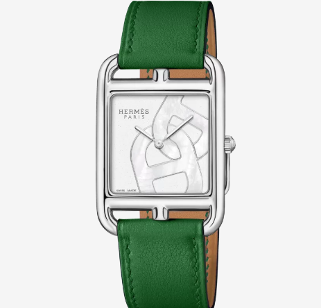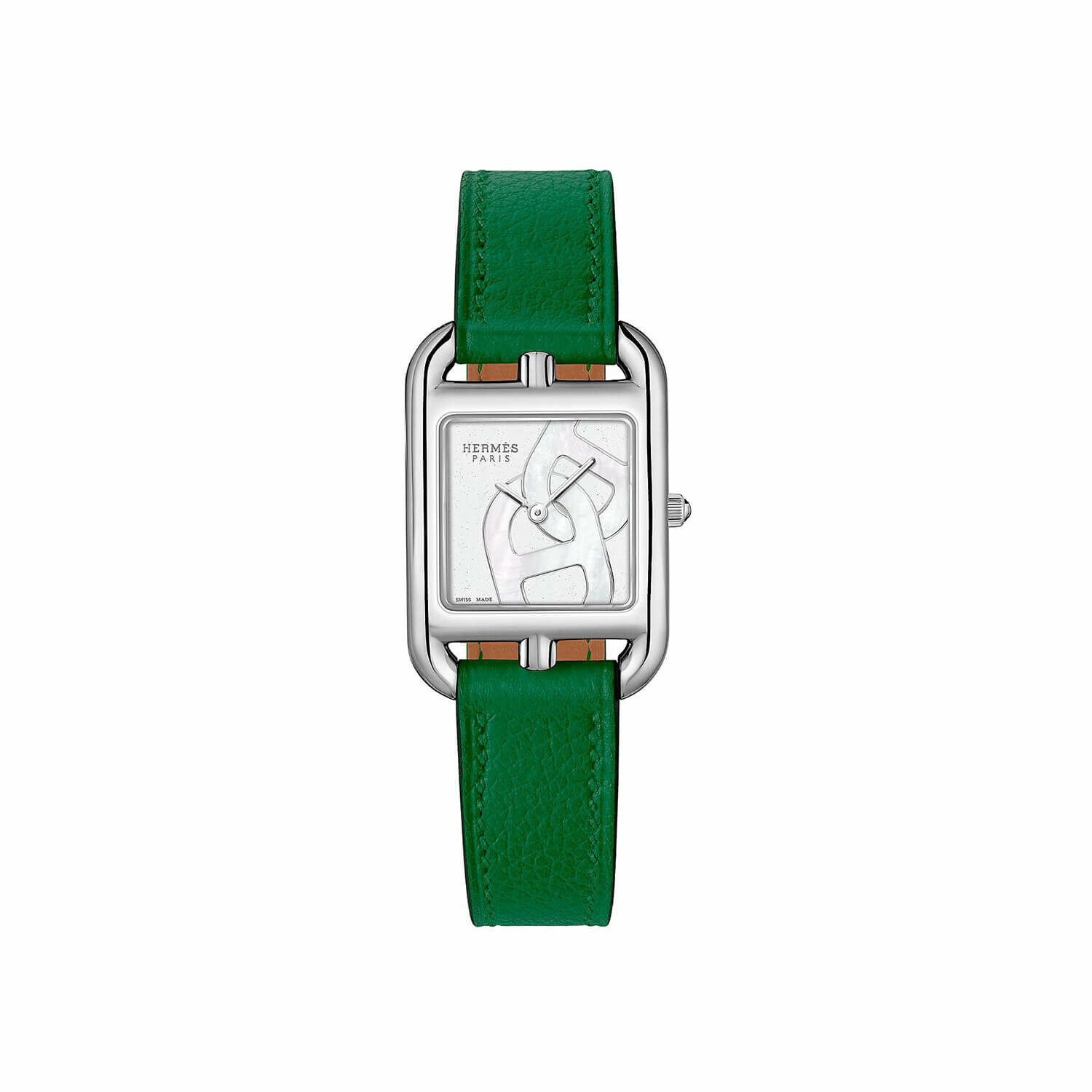 Hermès, "Cape Cod GM", mouvement quartz, boîte acier, cadran laque blanche & nacre blanche, motifs chaîne d'ancre, verre saphir, étanche. Bracelet veau swift vert cactus et boucle ardillon acier. réf. W057385WW00