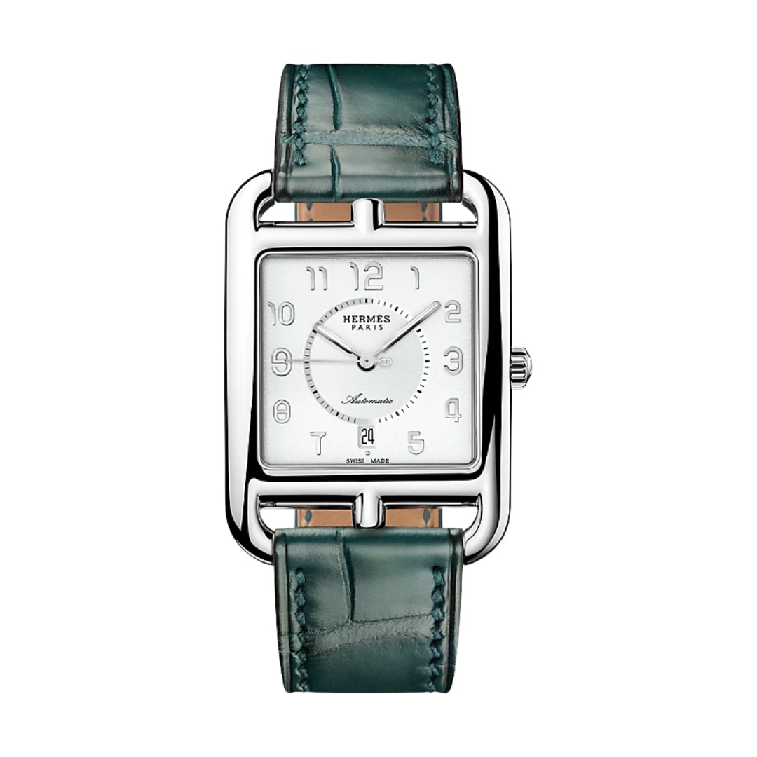 Hermès, "Cape Cod GM", mouvement automatique réserve de marche de 42h., boîte acier, cadran blanc, chiffres arabes, date à 6h, verre saphir anti-reflets, étanche 30m, réserve de marche 42h. Bracelet interchangeable simple tour en alligator mat cyprès et boucle ardillon acier.