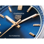 Contrastant avec un cadran satiné soleillé bleu foncé, les aiguilles et les index appliqués plaqués or rose 18K 5N donnent à cette TAG Heuer Carrera des allures d’icône. Un modèle équipé du mouvement Calibre 7 et résolument tourné vers la victoire.