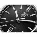 Cette TAG Heuer Carrera Date de 39 mm est une version élégante d’un classique. Elle allie caractère audacieux et touche contemporaine. Son cadran noir azuré et son bracelet sportif en cuir aux accents orange offrent un charme intemporel, le tout alimenté par un robuste mouvement automatique.