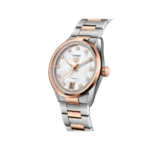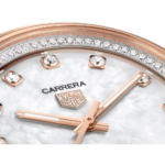 Adoptez une élégance raffinée avec cette TAG Heuer Carrera Date de 36 mm, où l'iridescence de la nacre fait écho au luxe intemporel de l'or rose massif 18K 5N — un hommage à l'héritage de la Carrera originale, réimaginée avec une sophistication sobre.