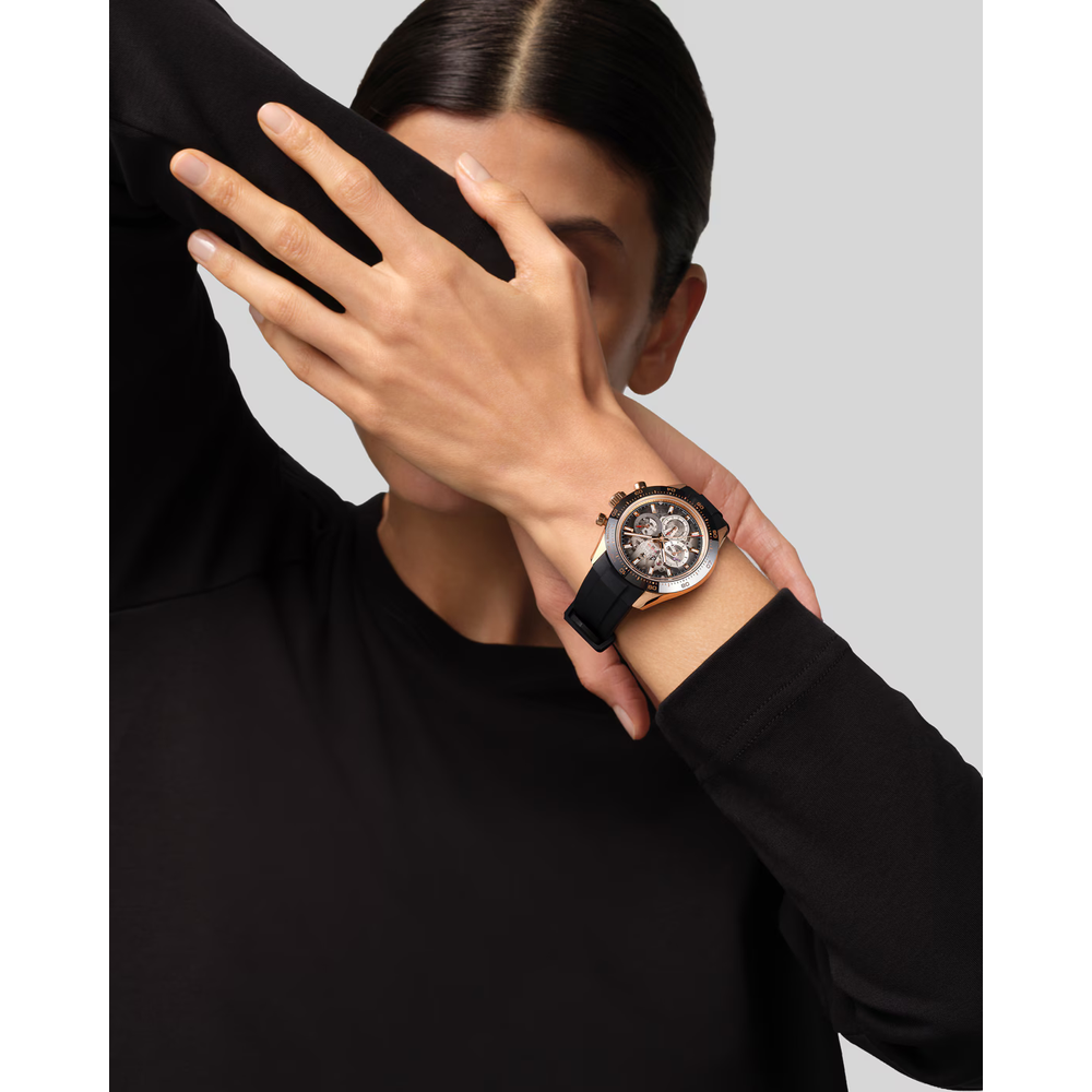 La CHRONOMASTER Sport Skeleton présente un boîtier en or rose de 41 mm surmonté d’une lunette en céramique noire. Elle se porte sur un bracelet en caoutchouc noir. Son cadran en verre saphir dégradé présente les compteurs tricolores superposés signature de la marque. L’ensemble laisse apparaître le calibre squeletté El Primero 3600 SK, un mouvement de chronographe à remontage automatique haute fréquence avec fonction chronographe affichant les 1/10e de seconde et une réserve de marche de 60 heures.