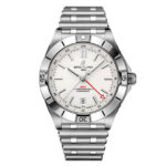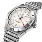 La complication GMT est animée par le Calibre Breitling 32. Sa graduation 24 heures permet à l’utilisateur de suivre un second fuseau horaire et de savoir d’un coup d’œil s’il fait jour ou nuit, tandis que la couronne de type « oignon » (une caractéristique classique des Chronomat qui doit son nom à sa forme de dôme cannelé) permet des réglages faciles. Montre sportive polyvalente, destinée à faire le lien entre les univers Air, Terre et Mer de Breitling, la GMT 40 affiche une impressionnante étanchéité jusqu’à 200 m.