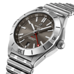 La complication GMT est animée par le Calibre Breitling 32. Sa graduation 24 heures permet à l’utilisateur de suivre un second fuseau horaire et de savoir d’un coup d’œil s’il fait jour ou nuit, tandis que la couronne de type « oignon » (une caractéristique classique des Chronomat qui doit son nom à sa forme de dôme cannelé) permet des réglages faciles. Montre sportive polyvalente, destinée à faire le lien entre les univers Air, Terre et Mer de Breitling, la GMT 40 affiche une impressionnante étanchéité jusqu’à 200 m.