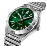La complication GMT est animée par le Calibre Breitling 32. Sa graduation 24 heures permet à l’utilisateur de suivre un second fuseau horaire et de savoir d’un coup d’œil s’il fait jour ou nuit, tandis que la couronne de type « oignon » (une caractéristique classique des Chronomat qui doit son nom à sa forme de dôme cannelé) permet des réglages faciles. Montre sportive polyvalente, destinée à faire le lien entre les univers Air, Terre et Mer de Breitling, la GMT 40 affiche une impressionnante étanchéité jusqu’à 200 m.