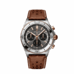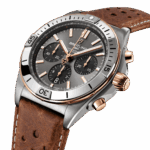 Pour rappeler les détails de la moto, le contrepoids de l’aiguille centrale de chronographe porte le logo discret de Triumph en forme de bouclier, le fond de boîtier est gravé de la mention « Triumph Edition » et le bracelet est en cuir de veau perforé.