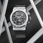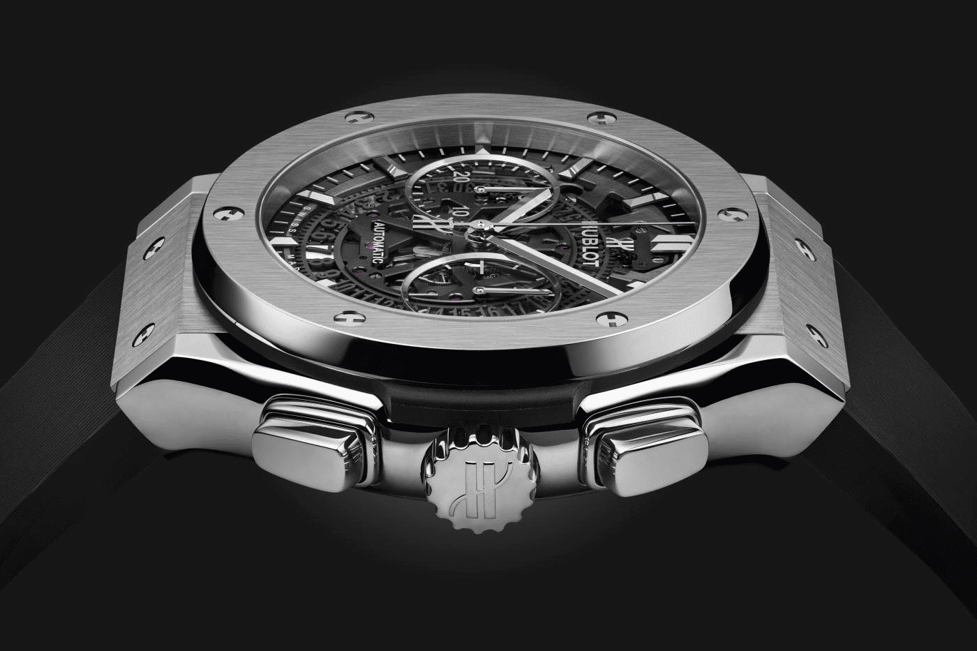 Hublot Classic Fusion Aerofusion Chronograph Titanium, chronographe mouvement automatique, réserve de marche 42H, boitier titane 45mm, étanche 50M, cadran squelette index, date, bracelet caoutchouc noir, boucle déployante acier