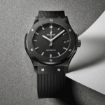 Hublot Classic Fusion Black Magic 45, mouvement automatique, réserve de marche 42H, boîte céramique 45mm, étanche 50M, cadran noir mat index, bracelet caoutchouc noir, boucle déployante acier.