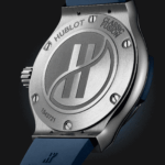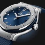 Hublot Classic Fusion 33, mouvement quartz, boîte titane en 33mm, étanche 50M, cadran bleu, index, bracelet caoutchouc bleu, boucle déployante acier