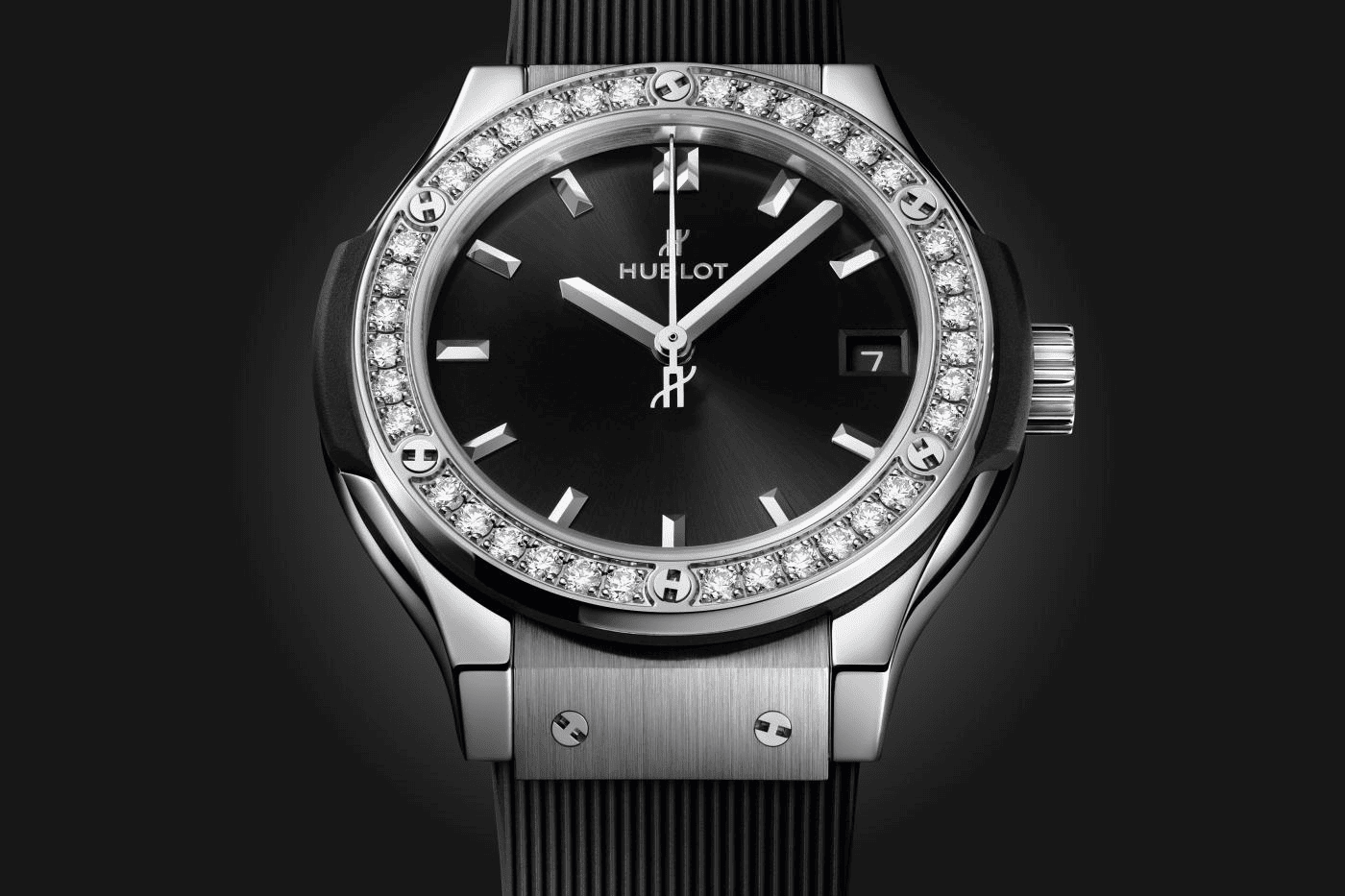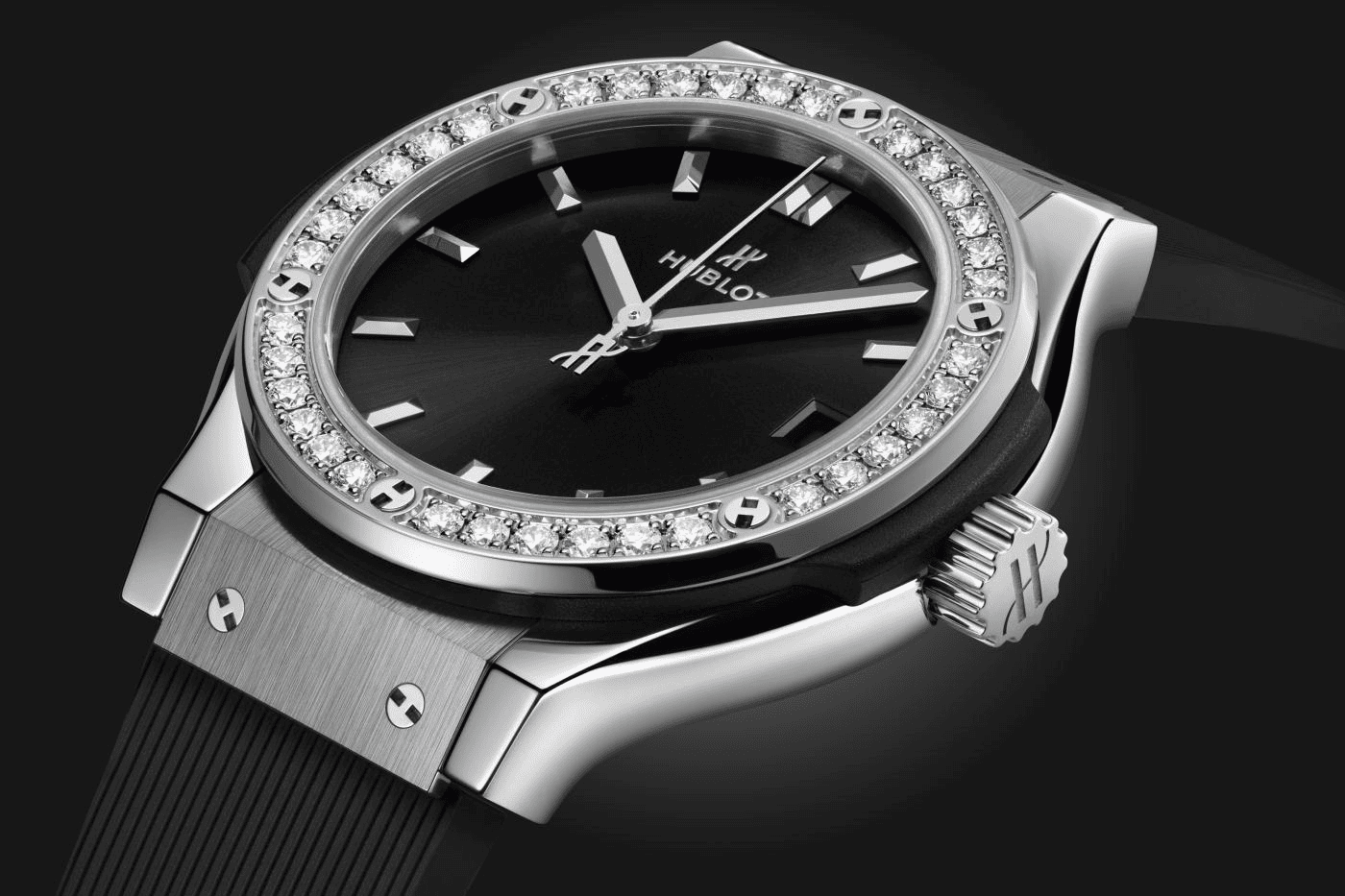 Hublot Classic Fusion Titaium Diamonds 33, mouvement quartz, boitier titane 33mm, lunette sertie de 36 diamants total 0.80ct, étanche 50M, cadran noir, index, date, bracelet caoutchouc noir, boucle déployante acier