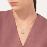 Nudo révèle de fascinants pendentifs en or rose et prasiolite. La pierre précieuse, au milieu, est entourée par une bande en or offrant un double jeu de lumière ainsi que de nouvelles expériences chromatiques grâce à la taille unique de Clessidra signée Pomellato. Pour une finition étincelante du bijou, les diamants blancs sont sertis dans une rondelle au-dessus de la pierre précieuse.