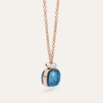 Ce pendentif Nudo Mini présente une topaze bleu Londres taillée en clessidra qui capture les profondeurs mystérieuses des eaux crépusculaires. La pierre semble flotter en apesanteur sur sa chaîne en or rose, couronnée d'une délicate rangée de diamants blancs taille brillant. Les dimensions plus réduites du pendentif apportent une polyvalence supplémentaire au design iconique Nudo, tout en préservant sa présence sophistiquée. Les nuances bleu profond dansent avec l'or rose lumineux, faisant de cette création une signature raffinée, aussi bien pour le jour que pour le soir.