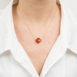 Une ligne d'une grande pureté, sans griffes, ni serti, une chaîne en or traverse délicatement la pierre.