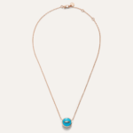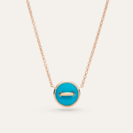 Ce nouveau collier réversible à pendentif dévoile, d’un côté, une surface raffinée en or rose soulignée d’un filet de diamants, et, d’un simple geste, laisse apparaître une turquoise éclatante ourlée d’un fil d’or rose. Cette turquoise a été minutieusement choisie pour son exceptionnelle pureté, une qualité rare dans la pierre naturelle. L’alliance de la turquoise, de l’or rose et des diamants offre deux styles bien distincts, incarnant à merveille la polyvalence signature de Pomellato et son expertise unique des gemmes.