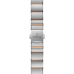 Calibre OMEGA 4061 : Mouvement à quartz avec fonction « Long Life » pour optimiser l’autonomie de la pile. Logo Omega rouge exclusif avec composants rhodiés et perlage.