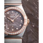 Cette montre de 25 mm est dotée d'un boîtier et d'un bracelet mono-rang en acier inoxydable et or Sedna™ 18K. Elle arbore les caractéristiques signature de la Constellation, dont les griffes polies, les facettes en demi-lune et une lunette pavée de diamants.