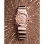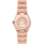 La montre est présentée sur un bracelet mono-rang signature doté d'un système de réglage confort et animée par le calibre OMEGA 4061, dissimulé derrière un médaillon estampé Observatoire Constellation sur le fond de boîte.