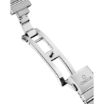 Calibre OMEGA 4061 : Mouvement à quartz avec fonction « Long Life » pour optimiser l’autonomie de la pile. Logo Omega rouge exclusif avec composants rhodiés et perlage.