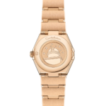 La montre est présentée sur un bracelet mono-rang signature doté d'un système de réglage confort et animée par le calibre OMEGA 4061, dissimulé derrière un médaillon estampé Observatoire Constellation sur le fond de boîte.